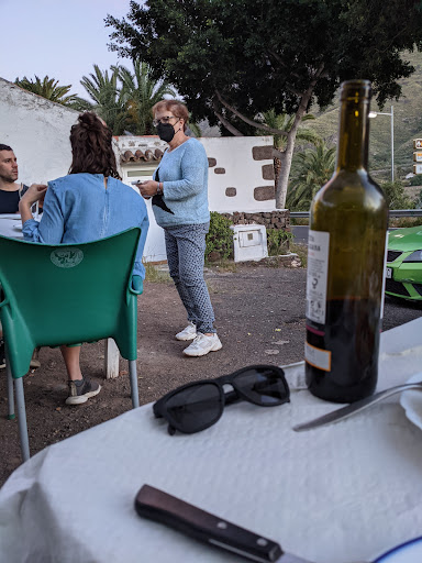 Ponieważ mieliśmy dużo czasu do przyjazdu autobusu, szukaliśmy miejsca, gdzie moglibyśmy zjeść obiad. W winnicy niestety restauracji nie ma. Na pytanie, gdzie w okolicy można by coś przekąsić, obsługa poleciła knajpę, znajdującą się około 20 minut piechotą w stronę Agate o nazwie Casa Lolo. Nie żałowaliśmy tego krótkiego spacerku. W Casa Lola zamówiliśmy rybę z grilla, która została podana z pysznymi gotowanymi papas arrugadas. Zamówiliśmy również sałatę owocowo-warzywną, która okazała się wspaniała. Były w niej świeże warzywa, tuńczyk, awokado, papaja i mango. Były pomidory, które na dodatek miały smak. Już dawno nie jedliśmy tak pysznych pomidorów. Do tego podano mojo rojo oraz sos czosnkowy. Należały do najlepszych, jakie mieliśmy okazję spróbować. Porcje były tak obfite, że na końcu zostały nam jeszcze kartofelki i chlebek, których niestety nie daliśmy rady wcisnąć. Z wielkim żalem patrzyliśmy na nie. Przydrożny bar utrzymany jest w kolorycie lokalnym, gdzieniegdzie sztuczne kwiaty, radio w tle, trele-morele jest i hiszpański koncert życzeń. Jest też oczywiście etatowy kot, który się nie łasi, bo widocznie dobrze jest odżywiany. Obsługa bardzo miła. Ceny...