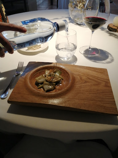 Pasa el tiempo y nos vamos comiendo el pan y bebiendo el vino mientras esperamos los platos. Pedimos una segunda botella. Se vuelve a romper el corcho al sacarlo , y se sirve de igual manera que el anterior con restos del tapón flotando en las copas.