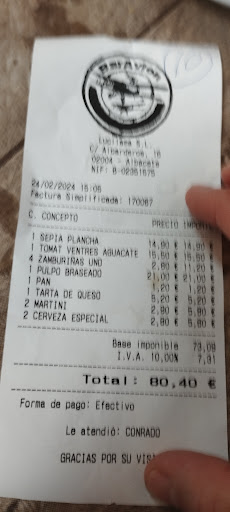 Read moreConsidero que los clientes nos llevaríamos menos sorpresas desagradables si al pedir la carta, la camarera te la llevase y pudieses consultar en unos minutos lo que quieres tomar y los precios, en vez de insistir en ser ella la que te lo cuente. El sábado pasamos por este local y decidimos entrar a preguntar si tenían sitio para tomar algo, estaba lleno pero amablemente enseguida nos buscaron una mesa y nos acomodaron con nuestra bebida. Era la primera vez que íbamos y al llegar la camarera, le pedimos la carta pero ella nos dijo que nos la contaba: Ensalada de aguacate Tomate solo o con ventresca Pulpo Calamares Una bandeja de zamburiñas, mejillones y navajas. Chuletón En el poquito tiempo que llevábamos allí, vimos pasar platos de oreja, con buena pinta y le preguntamos, terminamos pidiendo, la oreja , unas croquetas de las jornadas, los calamares y ante la insistencia de la camarera , la bandeja de zamburiñas, mejillones y navajas. Todo bien, pero estando cenando nos dimos cuenta que este restaurante es especialista en rebozados y fritos y que a otras mesas estaban llevando platos que no nos habían ofrecido a nosotros. Cuando al final nos traen la bandeja en cuestión, vemos que se trata de una mariscada y deberíamos haberla devuelto porque no sé correspondía con lo que nos habían ofrecido pero por no ser toca narices , nos la quedamos, el producto fresco bien pero el congelado regular y aquí entendimos que nos habían metido un gol, que hacíamos en un sitio como este de tapas caseras y rebozados tomando marisco? Pues seguir las recomendaciones de su camarera, que se supone conoce el local y sus platos estrella. Después de marcharnos, he buscado reseñas donde recomienden los clientes esta mariscada y no he encontrado ninguna favorable, tanto por la calidad como la relación calidad precio.La recomendacion nos costó casi el doble que el resto de la cena con la bebida. Todo este malestar se podría haber evitado , si al preguntar por la carta la camarera nos hubiese entregado la carta con sus precios como sucede en la...