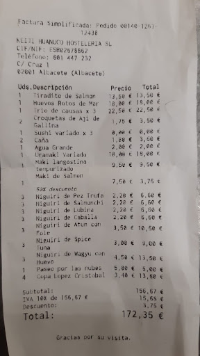 Read moreEl domingo pasado fuimos a Keiji a comer. Nos gusta el restaurante; a veces hemos pedido para casa, y en alguna ocasión hemos acudido allí. Éramos tres comensales. Pedimos unas croquetas de ají, que estaban buenas, el trío de causas, que no dejaban de ser unas croquetas de patata y no nos gustó mucho, y los huevos rotos de mar; deliciosos. También pedimos una tabla de sushi para tres. Esta última era excesiva para tres personas; muy completa: sushi tempurizado, niguiris, uramaki… todo estaba rico, y nos llevamos el que sobró, ya que era muy grande. El susto llegó cuando vino la cuenta: 172 euros con un postre para los tres, y ni siquiera pedimos una botella de vino (cada copa de un vino normalito a 3,40 tampoco está mal…), ni café… La dichosa tabla alcanzó un precio de 90,65 euros. El caso es que nos habían cobrado todas las piezas por separado… y tuvieron el detalle de hacernos una rebaja del 50% en una de ellas (¿?). Si hubiéramos especificado que queríamos esas piezas en concreto, entendemos que tienen ese precio, y las pagamos tan a gusto, pero si una tabla de sushi según la carta del restaurante tiene un precio de 35 euros para dos personas… para tres tan solo había que sumar la parte del otro comensal. Al comentarle al camarero nuestro descontento, alegó que el chef no cerraba el precio de la tabla de sushi, sino que ofrecía lo que él consideraba… No sé si es un problema de mala fe o de mala praxis, pero me parece un abuso en toda regla, y no pienso volver en...