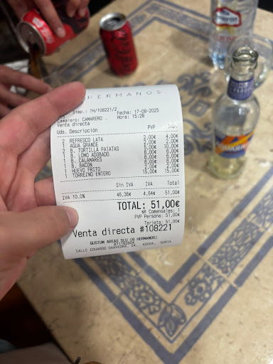 Read moreLamentablemente, mi visita a Restaurante 6 hermanos nos ha resultado ser una tremenda decepción. Para empezar los bocadillos dejaban mucho que desear, en especial el de Calamares, he pagado 6 euros y exactamente han venido en el bocadillo 6 calamares, me he acercado a la barra a reclamarlo a uno de los camareros, pero me ha comentado, "que así se lo sacan de cocina" (su jefe), simpático el chico,lo único que se salva del restaurante, bocadillo de tortilla ya listo y recalentado en el microondas, y torreznos a precio de comensal adinerado, dónde te los presentaban en rodajas, con más carne que grasa, sin crujiente y poco hechos. Entendible al ser un sitio de carretera, muy concurrido, donde la prioridad es que el cliente coma y se vaya,que salgan todos los platos rápidos, sin dedicarle mucho tiempo a la cocción, pero incomprensible que haya tan poco mimo y GRACIA a la hora de presentar los platos. Jefe preocupado de llenarse los bolsillos, sabiendo que el 3/4 nos morimos de hambre en la carretera y nos confirmaríamos con ir al Burguer King que tienen a lado.