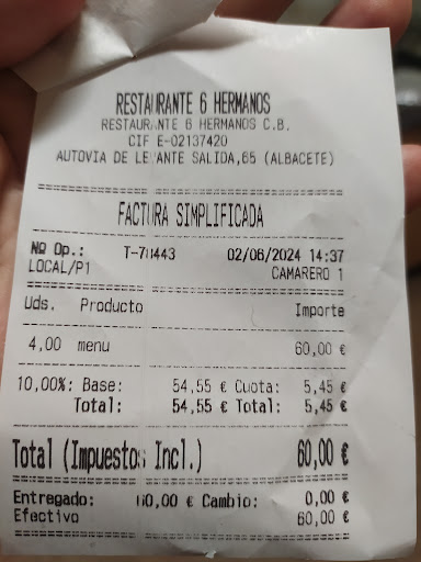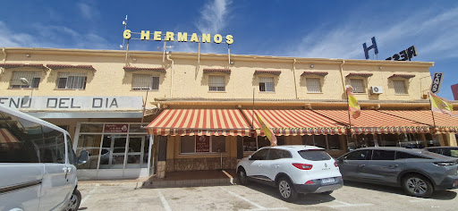 Read moreCuando llegas por primera vez es un poco "confuso", primero por la entrada desde la autopista que no está, digamos, del todo bien señalizada y adaptada. Y segundo, porque al entrar al recinto te encuentras con 4 estancias: En orden de entrada al recinto, tendrás otro bar-restaurante más de "batalla" bajo mi punto de vista, que dispone también de tienda de cuchillos y objetos punzantes "made in Albacete" que son una maravilla. Y digo "de batalla " porque no disponen de servicio en mesa, aunque tienen una carta con variedad de cosas. Separando el restaurante "6 Hermanos" del restaurante del punto anterior está el parking que rodea a un (actualmente) Burguer King. Mi recomendación es que no aparques nada más entrar con el coche y rodees dicho parking ya que, no solo podrás aparcar en zona de sombra (cosa que la primera sección de dicho parking no tiene) sino que aparcarás más cerca del restaurante en cuestión (a pesar de que el restaurante dispone de aparcamiento en su puerta, por si quieres probar suerte). Una tienda mas amplia de utensilios de cocina. 3 bis. El puestecito de fruta del señor "de siempre". Y por fin, el restaurante del que hablamos.