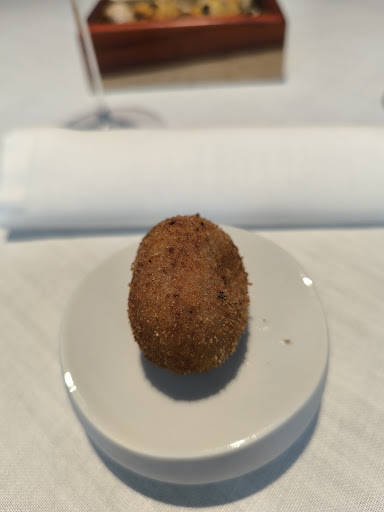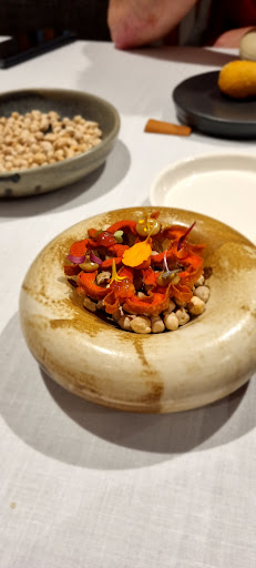 Para empezar, el local es muy bonito y acogedor, la luz cálida, todo está muy limpio, y con una temperatura muy agradable. Debo reconocer que estaba un pelín preocupada al principio, por alguna reseña que leí antes de ir, sobre lo molesto que es el ruido de la cocina. Nada más lejos de la realidad. Nos tocó la mesa más cercana, y nos sorprendió gratamente la tranquilidad y serenidad tanto de la cocina como de la sala. En cocina, nunca un tono de voz alto, ni platos golpeando, se integra plenamente en la experiencia, y en sala, incluso presentando cada plato y cada vino con lujo de detalles (pedimos el menú con maridaje) las camareras los hacen con suficiente tono para que se escuche, pero nunca llegas a oírlas cuando están en otras mesas.