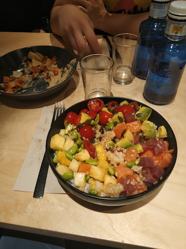 Tiempo de espera en ser atentidos excesivo (30 minutos), el tiempo de espera en servirnos fue aceptable. La calidad de la comida fue muy buena, la presentación increíble. La atención por parte del personal regular: tuve que pasar en más de una ocasión a ver si podrían atendernos, me sentí bastante ignorada. Entiendo que era noche de sábado, pero si no podían atendernos hubiese preferido que me lo dijesen, o al menos el tiempo de espera de alrededor de 1h. Cuando fui a pagar todo junto con tarjeta ni me fijé en el tiquet, al luego compartirlo con mis amigos me di cuenta de que cobraron a precio de pone tanto el poke como la ensalada, siendo un euro más barata la ensalada. Tuve que volver al local y me devolvieron el euro de diferencia sin ponerme inconvenientes, pero me pareció muy mal...