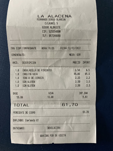 Read moreComo para cenar y como para comer puede ser bueno y todo lo que tu quieras pero la unica queja que tengo es de un camarero que supongo que es el mas mayor de los que hay alli trabajando ( el mas bajito ), porque no se le ve ni una sonrisa ni un hola y ni un adios.. yo llevare menos tiempo que el trabajando en la hosteleria pero vamos, siempre le pongo mi sonrisa a todos los clientes ya vayan a sacar tabaco o a pedirme cambio o a lo que sea y si por alguna casualidad no tengo cambio tambien se decir que lo siento o perdon o alguna cosa de esas y si estas arto de trabajar de hostelero no trabajes y si estas cansado de echar muchas horas buscate otro trabajo chico, que si que todas las veces e ido a sacar tabaco, pero no podras verme en mi bar y aunque sea saludar a alguien que vaya a sacar tabaco o solo a pedir cambio no me veras nunca negarle un saludo o un adios y menos mal que solo e estao unas cuantas veces porque si voy alli a cenar o a comer y me va a atender el pregunto que si me puede atender otro y si no se puede pues me voy que estoy en mi derecho y ya ire otro dia.. porque vamos, telita...
