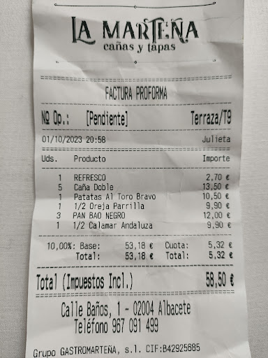 Read moreMe ha parecido muy caro en comparación con la calidad de los platos, el cazón estaba duro y trozos pequeños, a ese precio la ración me parece muy caro, hay muchos sitios en albacete para cenar, no creo que vuelva. Buenos días, gracias por su respuesta , decirle que en ningún momento me he sentido engañado ya que como bien indica usted los precios son públicos y creo que por mis palabras no se puede desprender que me han engañado, por otra parte mi forma de actuar es llegar, cenar , pagar y valorar lo que he recibido sin quejas ni reclamaciones, con lo que considero que la valoración para mi es mas clara, tampoco he dicho que el cazon estuviera malo, que me parecia caro para la calidad que vi, como tambien me parecio caro el agua a 2.5€ cuando vale menos de 1€, lo que no le acepto que diga que no tengo empatía con el sector porque su restaurante me parezca caro ya que no es cierto. saludos. Y respondo otra vez, le indico que el agua "solan de cabras"0.75 L sigue a menos de 1€ en el super del C.I tal y como decia en mi comentario. Le agradezco sus recomendaciones de donde tengo que cenar o comer y las valoro tal y como se merecen, yo no tengo elementos, ni lo conozco a usted como para osar recomendarle nada. Insisto en mi experiencia y me reafirmo con cada respuesta mas, que en Albacete hay una oferta muy amplia, variada y para mi mejor que su Restaurante y este mes de octubre 2023 se pueden probar con las...
