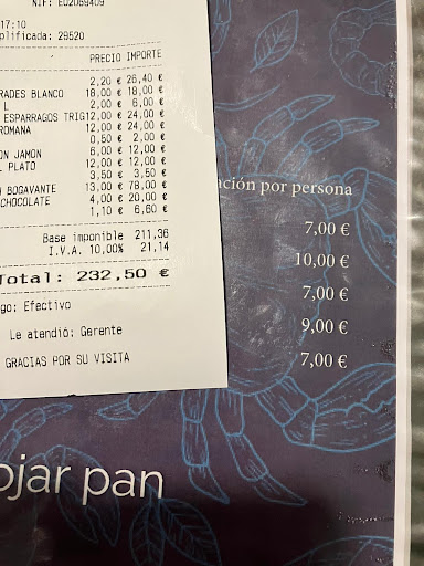 Read moreEn decadencia, hemos comido en la terraza, nos traen primero los entrantes, por cierto fríos, después la bebida con yema incluida (el vaso lo trae cogiéndolo por el borde superior) el arroz al señoret, por un lado soso y por el otro más salado, nos dice el camarero (Raúl) ahora os traigo el pan y alioli, no trajo nada, la bebida se nos agotó y comimos a palo seco, nos quedamos sin ganas de pedir postre o café, ya no quisimos ni agua, pedimos la cuenta en 3 ocasiones, al final hemos tenido que pasar dentro a pagar, nos han cobrado el pan y el servicio ( pan que no ha servido y el servicio pésimo) cuando nos hemos quejado que no ha puesto pan, Raúl el camarero dice que el servicio sí, el jefe ha dicho que no nos lo cobrase, pero estábamos tan enfadados que no hemos querido discutir y lo hemos pagado, por cierto no nos han cambiado los platos sucios de los entrantes, por unos limpios para comer el arroz, por supuesto para no repetir ni...