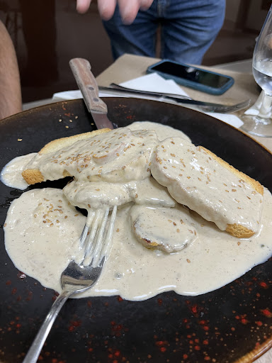 En segundo lugar, la camarera que nos atendió se equivocó de plato hasta 5 veces, iban de aquí para allá sin ningún sentido ,pedimos 3 croquetas y pusieron 6 pero tampoco nos quejamos.
