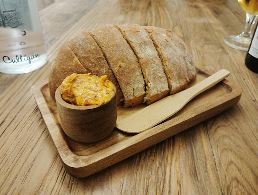 🍞 Pan con personalidad propia: Le siguió uno de los grandes aciertos de la comida: pan de espelta acompañado de una mantequilla de tomate seco que sorprendía por su intensidad. El pan, esponjoso y con textura perfecta, fue una joya en sí mismo.