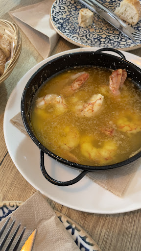 Pero la comida podría mejorar… Los camarones al ajillo no tenían sabor alguno, tenían demasiada grasa; llevaban ajo picado, pero sin sabor alguno; prueben con ajo machacado y frían bien los camarones con él. El chuletón estaba cocinado a mi gusto; le habría venido bien un poco más de sal para realzar el sabor, pero la carne en sí estaba buena. Las patatas fritas eran claramente caseras, pero si las hubieran cortado en gajos más finos habrían estado más crujientes, no medio fritas como las que me sirvieron.