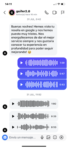 Añado una foto donde demuestro que te conteste por privado al mensaje que me mandaste. En los audios que me mandas al final simplemente te excusas en que la carne no se que, la salsa no se cuanto y que es imposible que estuviera mala. Y que debería habérselo comunicado todo al camarero.