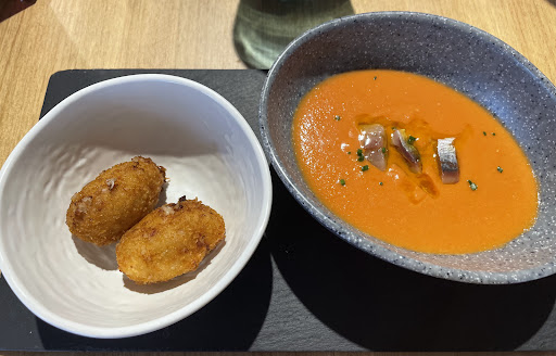 📷 corvina con gazpacho thai de coco Estaba muy rica , con un puerro de guarnición a la brasa exquisito. Solo me ha chocado q el gazpacho estaba frío...como corresponde a un gazpacho claro ...pero me habría gustado más caliente
