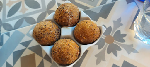 Croqueta de espinacas, albahaca y parmesano🥦🧀 (buenas y de sabor muy suave) y croqueta de pollo tikka masala, original y muy rica también.🍗