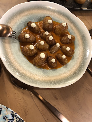 Un sitio realmente acogedor y agradable. Mi pareja y yo no conocíamos ningún restaurante de la zona y veníamos de viaje para pasar el fin de semana y sin duda nos fuimos más que satisfechos. No os podéis imaginar lo bonito que era el sitio, cada detalle de decoración nos pareció precioso a parte de súper acogedor y la camarera fue un amor en todo momento. Yo soy vegetariana y es difícil a veces encontrar opciones y aquí no tuve problema alguno. Nos pusieron un pequeño aperitivo antes de pedir y nos invitaron a probar otros 2 aperitivos más, unos mejillones en escabeche (si no recuerdo mal) y una berenjena con queso feta que estaba riquísima, la textura brutal. Además, al poco tiempo de sentarte te ofrecen 2 tipos de panes y te dejan 2 tipos de aceites diferentes, lo cual se agradece y hace que la experiencia dentro del restaurante sea mas “divertida” por así decirlo, ya que te dan opciones para probar diferentes sabores. A mi pareja le pareció muy curioso un aceite con sabor a tomate natural, muy muy bueno. Nosotros pedimos una ensalada de burrata con pesto, unas patatas baby con brava y alioli, cortadas al detalle por cierto, y muy ricas y unas croquetas. Lo dicho, todo muy rico, cuando las personas trabajan de corazón se nota y esta vez, lo notamos al 100%. De postre pedimos una tarta de queso que venía acompañada de una mermelada de arándanos (la cual estaba apartada de la tarta, cosa que nosotros agradecemos), nos quedamos sin palabras, estaba riquísima y la mermelada se notaba que era casera y es una de las mermeladas más ricas que he comido nunca. En general, una experiencia de 10. Quiero repetir el trato de la camarera, en todo momento muy atenta, agradable, simpática y dedicada a explicarnos cualquier cosa que necesitásemos saber....