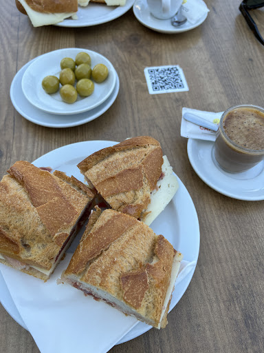 Great jamon serrano, cheese, olives, baguettes sandwiches. Loved their spanish tortilla. On the second visit I ordered the Tapas Variadas (a mix of local meats and some veggies in sauce). There was no sauce but a pool of oil, which couldn't be eaten, almost like a soup, but it was just fat and oil. I have sent the dish back to the kitchen as neither me or my companion could eat it and ordered a baguette at my own expense. When going to the bathroom I noticed the waiter chopping jamon serrano on the bar, with his bare hands, in front of customers (the same waiter who handles money etc). Didn't feel...