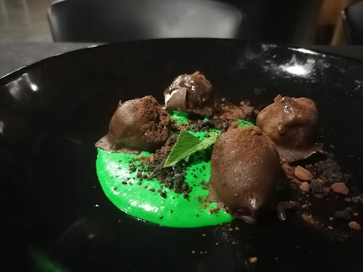 Y finalmente de los postres probé la tarta de queso, que es una tarta más bien seca, si uno espera una tarta de queso de esas que se derriten al cortarla, está no es. Viene con un helado de limón, sirope de fresas y base de galletas. Y las trufas caseras, están bien y la nata cremosa de hierbabuena está muy lograda, te deja los dientes y la lengua verdes como las chuches de cuando teníamos 7años, pero bueno.