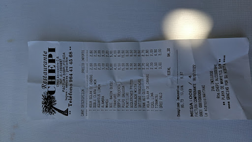 Aviso a los que van a comer el menú del día (adjunto foto del cartel de la entrada). Te preguntan qué vas a beber (el camarero que te pregunta está a la vez mirando su móvil, más interesado en lo lee que en lo que le pides). Luego te preguntan lo que vas a comer (otra vez mirando el móvil). La comida del menú es sosa y sin gracia, y servida de la misma forma. Cuando pides la cuenta te viene la sorpresa (adjunto foto de la misma). Cuando sorprendido le preguntas al camarero si la bebida no está incluida en el menú del día, te contesta que no. no lo pone el el cartel de fuera?- nos contesta... Que cada cual saque sus conclusiones... Por facturar 17€ más, han dejado de percibir más de 200€, que sería el resultado aproximado de los días que nos quedaban de vacaciones (con sus almuerzos, cervezas y posiblemente alguna cena a la carta) por las consumiciones que haríamos allí. Porque este es la tercera temporada que venimos al Chepi y es la primera vez que nos ocurre algo así. Si es un error (que parece que no) o un cambio en la política del local no lo sabremos nunca porque no nos verán el pelo nunca más y dejamos constancia de lo que nos ocurrió para...