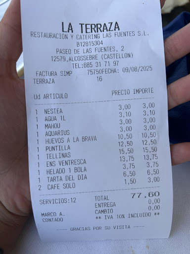 Read moreNo encontrábamos ningún sitio que nos convenciera para comer con unos amigos en Alcocebre y decidimos reservar en La Terraza del Náutico. Nos gustó mucho el establecimiento en sí: vistas directas a la playa de Las Fuentes, una terraza muy agradable y un interior con buen ambiente. Nos dieron la última mesa que tenían y aún estando dentro del local nos encantó la ubicación y poder disfrutar de una buena comida a pocos metros del mar. Pedimos varios entrantes y un principal para cada uno, pero recomiendo la ensalada de tomate y las costillas de cerdo. Los postres caseros también están muy buenos, innovando con los típicos tradicionales añadiéndole sabores y formas diferentes. En concreto, la tarta de queso fue un acierto. Espero poder volver a disfrutar de nuevo de este...