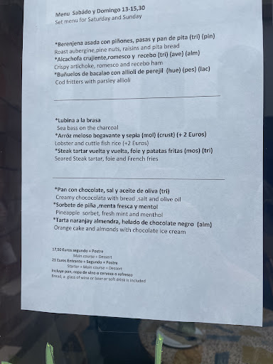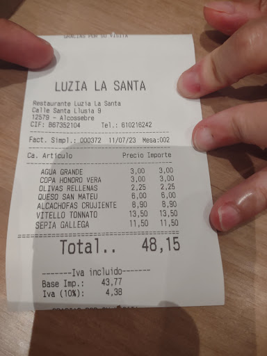 La comida es de lo mejor. Una carta original donde no te vas a encontrar platos típicos de restaurantes de la zona, tipo paella valenciana, pizza o canelones... Son platos con una vuelta de tuerca y están buenísimos. Las cantidades son buenas y podemos recomendar todo lo que probamos. Las alcachofas son sorprendentes y están buenísimas, por destacar algo pero todo está de diez. Aceitunas rellenas Santa Luzia Alcachofas crujientes con jamón Queso fresco con pepino.... Vitello tonnato carne asada a la parrilla... Sepia que quería ser pulpo a la gallega