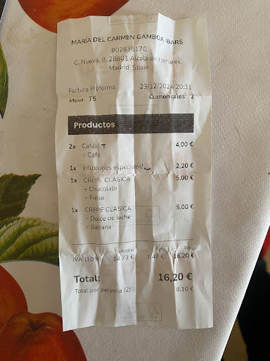 Read moreAyer 23/12/24. Me cobraron mucho más de lo que ponía en el menú. Tienen esto que se llama “café o té especial” que cuesta 2,2. Cuando les preguntas por qué es especial no saben decírtelo. La parte especial es que aunque no lo pidas es el dinero que vas a tener que pagar por el café pese a que el precio en el menú es 1,5. Luego pedimos dos crepes de los que en el menú pone a 3 euros. Nos trajeron unas crepes súper finas y con muy pocos trozos de fruta. Al ir a pagar nos cobraron 5€ por cada crepe porque según ellos el sirope de chocolate y la fruta son extra 😂😂. Cuando en el menú no pone nada de eso. Lo entendería el crepe hubiera estado rico y de tamaño decente, pero no era el caso. Según el camarero 3 euros es lo que cuesta solo la base sin nada del crepe. Por otra parte los cafés y la infusión (cobrada como especial sin haberlo pedido) estaban templadas tirando a frías ( el local no estaba lleno) Este sitio era bueno antes, ahora (24/12/24) día en el que escribo esta reseña,se que deja mucho que desear y se que no voy a...