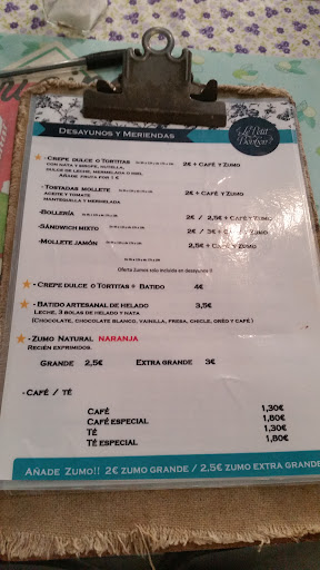 Read moreLlevo años yendo a este sitio. Hace un año hubo cambio de dueño. Antes el servicio era bueno y la relación calidad, cantidad y precio era correcta. Los menús de las fotos están anticuados, ahora es un par de euros más caro. Ahora mismo, pese a ser más caro, el sitio y su comida merece más o menos la pena, lo que no merece la pena es el servicio. Ya son varias las veces que, aún siendo cliente habitual, no se me ha atendido como esperado. Pidiendo lo mismo en diferentes momentos/días te lo hacen de forma diferente, entiendo que dependiendo de quien estuviera o de la carga de trabajo, pero había veces que estaba mucho mejor la comida y otras que daba pena. Me duele, porque el sitio es bueno, la idea es buena pero la gestión es bastante pésima. Faltan ganas. Lo que me ha hecho escribir esta reseña ha sido la gota que ha colmado el vaso: nos han cobrado 3 menús de creppes, creppe y bebida, dándonos solo la creppe y pidiéndolo así (y para llevar). 9,40€ por cada Creppe, sin bebida. Nos damos cuenta, damos la vuelta y le preguntamos si nos ha cobrado bien, nos dice que sí. Investigamos y vemos que otras veces por ese mismo precio hemos tenido comida+bebida (menú). De hecho en una contestación a estas reseñas ponen que ese precio es de menú. Además no nos ha hecho factura (fallo nuestro no pedirla). Insisto, una pena, años y años tomando ahí algo y ha ido a mucho peor. Normalmente solemos alabar la comida, porque si consigues que te atiendan bien, que se te sirva la comida buena y no te timen cobrándote, está muy bien. Son demasiados factores para comer bien a un precio algo elevado para lo que es, así que a otro sitio. No creo que vuelva por ahí, un...
