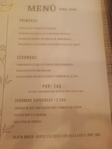 Tras llegar a comer, pedimos la hoja del menú del día, donde salen reflejados primeros y segundos platos (algunos de ellos, por ser especiales, conllevan un suplemento de 2,50€).