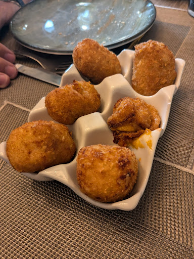 Para los platos principales, comenzamos con una selección de croquetas variadas: de boletus, de gambón y de jamón ibérico. Cada una de ellas estaba perfectamente elaborada, con un rebozado crujiente y un relleno cremoso lleno de sabor. Las croquetas de boletus fueron particularmente memorables, pero todas, sin excepción, estaban espectaculares.