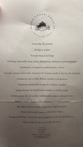 Read moreCocina moderna y elegante, sin artificios, en el corazón de la sierra de Ronda. Máxima finura elaborando verduras de temporada. Manejo perfecto de los aliños que se ve desde el primer aperitivo que nos pusieron. Un matrimonio auténtico y su hijo, que ha modernizado su cocina sin perder identidad y verdad. Un menú a base de verduras, todas perfectas de cocción y aderezo para darle un toque fresco. Productos locales con un hilo conductor, el aliño de los platos que aportan un toque perfecto de vinagre. Un local tradicional, el mesón de toda la vida, con música flamenca durante toda la comida. Decoración rústica. Aunque tienen que mejorar vajilla y cristalería, pero no es lo importante en este restaurante. Empezamos con un gazpacho de pepino. Más que un gazpacho era el agua del aliño de una pipirrana, todo el sabor de un plato veraniego. Acelga con un esparragado clásico. La acelga perfecta, ligero amargor reflejo de su frescura. Sabor toda la vida. Tomate rosa acompañado de una vinagreta de lechuga. Perfecto de maduración, carnoso y sabroso, casi dulce. Perfecto equilibrio del vinagre, la sal y el aceite, aporta y no camufla en ningún momento el sabor de un producto tan bueno. La ensalada de garbanzos y choco fantastica. Los garbanzos perfectos de textura, nada terroso ni pellejones, le acompañaban unos rabanillos y pequeñas tiras de choco. Seguimos con una lechuga a la brasa con una holandesa de anchoas. Tres sabores en una misma hoja, desde el tronco a la parte más verde de la hoja. Algunos trozos quemados que hacían que anulase el plato. El toque salado de la anchoa bueno, aunque troceada mejor. Tomates y cerezas encurtidas con una aliño donde la sal lo aporta unas huevas de merluza curadas. El aliño no hace falta repetirlo. Flores de calabacín con los calabacines babys, unas tiras curadas de lubina y alcaparras. Perfecto de cocción. La emulsión de la lubina cerraba el plato dandole untuosidad y el toque fuerte de las alcaparras otro acierto. El plato mas flojo de todo el menú, pimiento frito con una sardina a la brasa. El pimiento sin más y la sardina no estaba bien limpia, con muchas espinas. Nada especial. Posteriormente uno de los mejores platos, habichuelillas verdes con un gazpachuelo de caballa. Las verdura para llorar, crujientes y sabrosa. La caballa perfectamente hecha que con el gazpachuelo lo convierte en algo increíble. Cebolla asada acompañada de un solomillo de ternera. El punto fuerte del plato la cebolla, dulce, sabrosa y toque a brasa. El fondo con los alcaparrones dan un toque ácido que potencia los sabores. Luego un pichón con zanahoria encurtida, vuelve el toque ácido que recuerda al escabeche. Un pichón, rojo, con ese fondo y sabor no tiene competidor. Todas las cocciones y texturas perfectas. Berenjena con requesón, todo ligado con un jugo de chivo. Increíble, la berenjena con un toque preciso de brasa y el requesón le aportaba algo de frescura. El fondo de chivo hecho con mucho fundamento, puro sabor, sin grasa. Terminamos los salados con un rabo de toro, plato tradicional del mesón desde su apertura. Un plato que se nota que llevan haciendo toda la vida y lo bordan. Nos pusieron tres postres frescos y originales. Melocotón asado con almendras verdes y un helado de almendra amarga, perfecto. Mango con escabeche, vuelve a salir el vinagre que tan bien maneja. Finalizamos con un higo, perfecto de maduración, con un toque de vinagre de Jerez y helado. Buena carta de vinos, centrada en referencias andaluzas aunque con algún toque del resto de España y alguna referencia extranjera. Merece la pena desplazarse hasta allí para disfrutar de una buena mesa y con mucha personalidad. En conjunto una menú estupendo, con muchos productos excelentes y un toque ácido que parece su seña de identidad y que maneja de manera excepcional. Todos los platos muy bien elaborados y con...