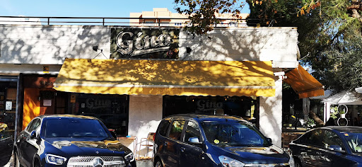 El interior es muy tranquilo, con música agradable y muy bien decorado. La terraza está en una zona tranquila. Cuenta además de con las típicas mesas y sillas, con sombrillas tanto en invierno como en verano, lo cual es muy útil por si llueve y para evitar que caiga nada de los arboles bajo los que se ubica. Gino está en una de las esquinas exteriores del antiguo centro comercial el Val. Fue seguramente el primer centro comercial que se construyó en la ciudad complutense y pese a décadas de actividad, aunque no es lo que fue en su día, no goza de mala salud y aun hoy tiene numerosos negocios, tanto dentro, como en los locales de fuera.