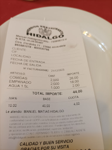 Read moreSometimes you just land on your feet, and this is how we felt after finding Hidalgo Pension in Alcaudete. There isn't a lot of English spoken here, but the proprietor was more than willing to help us out. The whole place is spotlessly tiled with marble. Room was reasonable size with a big bathroom. There is a good bar/restaurant, reasonably priced, and a patio out front, and the biggest plus - free parking! This little hotel is frequented by traveling business people, so this is the real deal, no tourists here. Double room $40E, generous meal and wine servings, plus they sell some olive oil products in the...