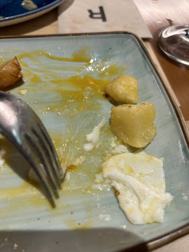 Las raciones, cantidad ridícula por el precio, las alcachofas con el supuesto foie, era con paté la piara, los huevos rotos con jamón, crudos como veis en la foto, las patatas de bolsa. Por no hablar de las gyozas, que eran de risa, parecían canicas de lo pequeñas que eran.
