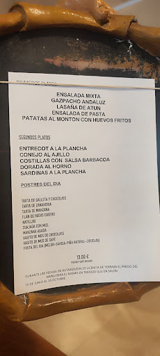 Read moreMenu at 11,5⏠with different choices. All of them Spanish traditional food. A good choice because of the price, quality and choices given. For lunch, it is better to arrive around 13PM. It gets crowded really quickly. Be aware that the wine offered in the menu it is not a good one. Recommended to mix it with lemon, coke...