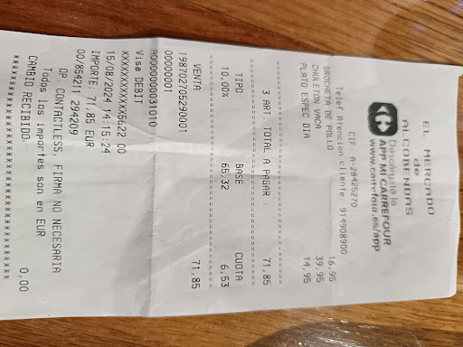 Buenas tardes, Mi reseña no va por la calidad de la comida ni por la gente que la hace, va por el propio restaurante en si. Hoy día 15 de Agosto, hemos venido a hacer algo de compra y ya estando aquí, pues hemos comido, lo que no sabíamos, es que íbamos a pagar como en un restaurante michelín.. Solamente, un chuletón, una brocheta y medio pollo 70EURAZOS.. Vamos...ni Ñeru, ni Tres Mares, ni Lardhy, es que ni en el Rodizio GUANABARÁ, que encima estaría mejor la carne en comparación, siendo un restaurante dentro de carrefour. Pues el pedazo restaurante michelín te cobra antes de que te den la comida y pedimos pensando que sería un precio razonable, yo me fui a por las bebidas y cuando vuelvo me dice mi marido lo que ha costado.. Tienen puesto un marco a mano escrito con lo que se puede pedir de comer, pero... SIN PRECIOS, los demás restaurantes todos tienen sus precios, este Michelin.. no.. Se lo comunico a la chica y me dice que si tienen carta con precios y que está ahí (señalándome unas hojitas puestas a un lado casi escondidas..) Es una vergüenza, sé que en parte fue culpa mía por no preguntar primero, pero no te esperas esa leche de un sitio así, y por supuesto no vuelvo a ir. También agradecería que fueran más claros y no tan Ladrones para...