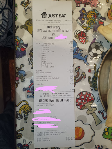--------CONTESTACIÓN A RESTAURANTE-------- Corroborado con JustEat que los repartidores son vuestros y ellos no pudieron contactarlos. En la descripción del pedido ponía claramente que se debía llamar por teléfono para que yo fuese a buscar el pedido. También hablé con recepción pensando que se dejó el pedido ahí y ellos no tenían constancia de ninguna visita de un repartidor de comida a la hora indicada. Por otro lado, os llame por teléfono en más de 10 ocasiones y nadie contestaba al número indicado en la aplicación de Just Eat. Muy feo eso de echar balones fuera y encima intentar echar la culpa de vuestro...