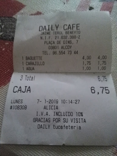 Read moreWir waren am 5. Januar in Alcoy, um den berühmten Drei-Königs-Umzug zu sehen. An diesem Tag quillt die Innenstadt, in der der älteste Umzug dieser Art Spaniens stattfindet, vor Menschen quasi über. Das führt natürlich auch dazu, dass vor dem Umzug praktisch alle Plätze in Restaurants und Kneipen sowohl drinnen als auch draußen (ja, hier kann man von den Temperaturen auch im Januar gut draußen sitzen) besetzt sind. Wir hatten das Glück, im Daily Cafe draußen einen kleinen freien Tisch zu erwischen, wo man schön inmitten des alten Platzes sitzt. Da es überall sehr voll war, kam es zu - wirklich nachvollziehbaren - Verzögerungen beim Service; und trotz all der Hektik blieb die für uns zuständige Mitarbeiter immer sehr freundlich - und alleine das ist echt eine ausgezeichnete Bewertung wert. Aber auch der Kaffee und die Sandwiches wurden unseren Erwartungen gerecht - sollte jemand mal in Alcoy sein, können wir das Daily Cafe somit...