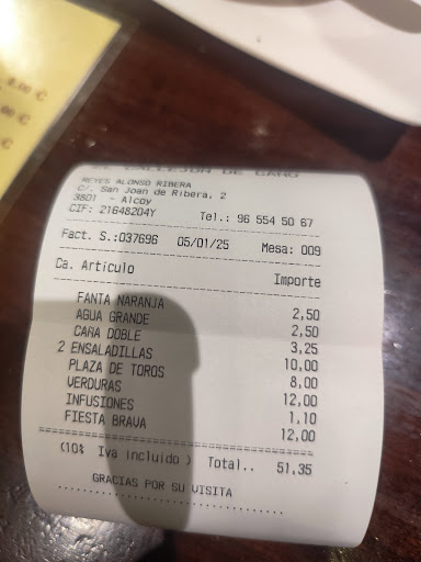 Anoche después de la cabalgata de reyes de Alcoy entramos en este bar para picar algo de cena antes de volver a Valencia. Nos atendió una chica majísima q enseguida nos ofreció una mesa y nos saca la carta. El local muy chulo. Pedimos 2 ensaladas(una de gulas y otra ensaladilla),unas bravas,berenjena con queso de cabra(fuera de carta) y un montadito plaza de toros. Nos sirvieron bastante rápido y la comida estaba buena.Yo me fijé en que había bastante descoordinación entre la que parecía la encargada y los cocineros. Allí la única que no paraba era la camarera que nos atendió q se le veía bastante profesional. La otra camarera iba como a cámara lenta. Bueno, la sorpresa llega con la cuenta. Según la carta las bravas cuestan 7€ y las ensaladillas variadas 3€. Adjunto foto de carta y ticket. Nos cobran 12€ de las bravas y 10€ de las dos ensaladillas.Nos quejamos a la camarera en cámara lenta y nos dice que es q la carta no está actualizada.Le decimos q deberían darla actualizada o por lo menos decirlo.Va a la encargada a comentarle y pasa de nosotros,guarda la carta y manda a la misma camarera a decirnos q es q el precio q pone en la carta es para 2 personas(nosotros éramos 4).A lo que yo le respondo que donde pone eso.Se vuelve a ir sin respuesta. La camarera profesional nos dice que enseguida está con nosotros y acaba por no aparecer nunca. La encargada ni se acercó a nosotros. Al rato vuelve la camarera a cámara lenta a decirnos: con tarjeta??. Le dijimos que sí pq no quería montarla pero le dije que no estaba bien lo que habían hecho y q,desde luego,pondría una reseña. A lo que me dio la razón como a los...