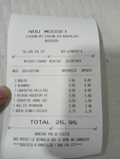 Read moreServicio lento. No hay problema en este aspecto porque eran poco personal. Cuando pedimos la cuenta, nos la sacan con un trozo de papel con rotulador escrito. Le pido que porfavor quiero ver el ticket. A lo que la camarera(una chica rubia, más mayor) con palabras textuales dice:" que pasa que no te fías? Se me ha terminado el papel, tranquila que ahora lo pago yo" y se va rechistando hasta dentro del bar y toda la terraza se entera de lo ocurrido. Como consumidor, tengo el derecho de saber el precio de cada producto. FIN. Los dueños del bar, en ese momento estaban en el bar, nos entienden y son muy amables con nosotros. Volveríamos solamente por los dueños, y obviamente si no está dicha camarera. Maleducada, con pocos modales y 0...