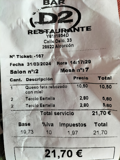 Read more1 estrella porque no puedo poner menos. Llegamos 6 personas a cenar a las 21:00 aprox, le pedimos de beber y la carta. Hasta ahi todo normal. Nos toman nota pero no nos dicen nada del tiempo que tardaría, cuando estaba el bar medio lleno (terraza llena, dentro vacio), sabiendo ellos que iban a tardar. Después de hora y media ya viendo que no nos traían nada de lo pedido ni unos simples cacahuetes, les preguntamos por dos veces que cuanto le falta a la comida sin respuesta alguna por su parte. Al rato nos traen un plato de nugget y 5 trozos de queso despues de haber preguntado por tercera vez por la comida siendo la respuesta de ellos que no sabian que tenian mucho trabajo. Y ahora es cuando viene la gota que colmo nuestra paciencia. A los 15 min de decirnos que venia ya la comida, nos traen una ensalada, un bocadillo de calamares y unas patatas bravas pero nadie de la mesa tenia cubiertos ni platos para servirse, después de pedirlos en 2 ocasiones y no traerlos decimos levantarnos, decir que nos lo pusieran para llevar y pagar la cuenta porque parece que les costaba mucho trabajo traer unos simples tenedores y platos despues del servicio nefasto que nos han dado. No repetiremos al 100%. Espero que a alguien le sirva esta experiencia nefasta que hemos tenido mi...