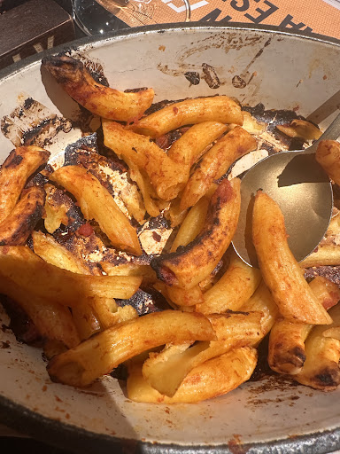 Too slow to give us cutlery, plates and napkins (some of our food had arrived and we still weren't given anything). My pizza arrived first and it sat waiting for its "extras" for at least 5 mins as we were waiting for another pizza to arrive. We were sat outside and it was quite cold out meaning my pizza was cold by the time I could start eating it). The pizza itself was very average. Another of our group had canellones and said they were bland.