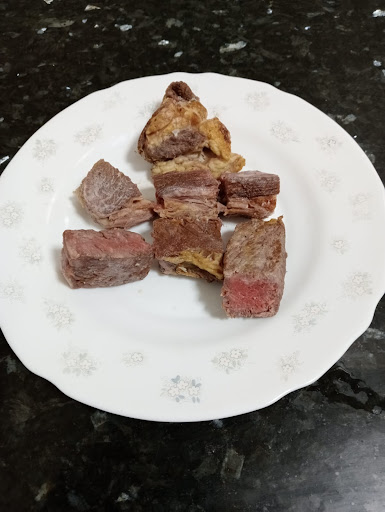 Nada más empezar, al pedir la comida, nos dijeron que no había cachopo. Esto ya nos sorprendió muchísimo: ¿cómo puede ser que en un restaurante asturiano, en unas fechas señaladas y a las 9:15 de la noche, no tengan cachopo? Es como si no estuviesen preparados para la clientela. Dado que no había, dos personas del grupo pidieron opciones diferentes, como una hamburguesa y una tostada de solomillo, mientras que el resto pedimos carne y entrantes variados.