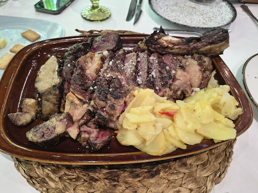 De plato principal pedimos un chuletón de 1 kg, madurado 55 días. En su punto exacto, tal y como lo solicitamos, jugoso y lleno de sabor. Lo acompañaban patatas hervidas y unas patatas fritas caseras deliciosas.