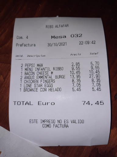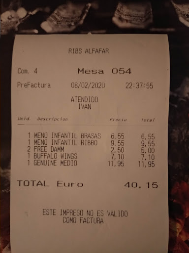 Read moreHoy hemos comido 4 personas en el Ribs de Alfafar. El camarero, muy amable, nos ha dicho que tienen un menú para 2 personas, que se elige un entrante por persona, dos principales y dos bebidas, pudiendo ser refresco o cerveza, y que si se rellenan se paga sólo un euro cada vez que se rellene, sean refrescos o cerveza. Una vez hemos pedido, le hemos vuelto a preguntar si las cervezas al rellenarlas se paga un euro. Nos ha asegurado que sí. Hemos comido y rellenado una de las cervezas. Al sacarnos la cuenta, nos hemos dado cuenta de que nos ha cobrado 3 euros y 5 céntimos extra por la cerveza que se ha rellenado. Al decírselo, nos ha pedido disculpas y ha entrado al restaurante para solucionarlo, arreglando el cargo del ticket. Parece ser que no se lo han permitido sus jefes, pues ha salido dehaciéndose en disculpas, diciendo que es culpa suya, pero que se ha equivocado y que no entran a un euro las cervezas que se rellenan del menú, pese a haberlo asegurado en dos ocasiones anteriormente.