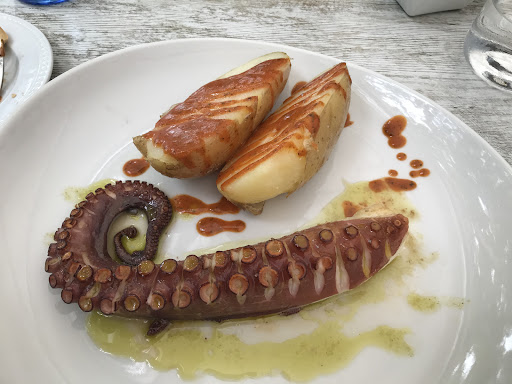 9 of us on a Tuesday lunchtime ate - and drank - very well for about €30 a head. Tomato salad, roasted red peppers with tuna, boquerones, calamares fritos, salmonetitos, almejas, mejillones, acedias, esculpinas (yuk - raw shell fish, hate it), and two giant crabs which were delicious. 3 bottles wine, beers all round first, water, puds, coffee, and a free Chupito to round off.