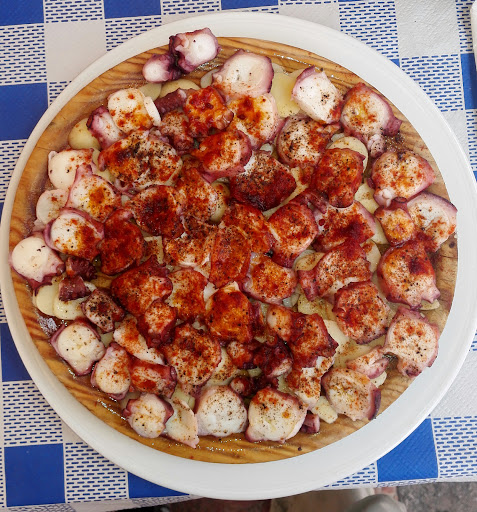 Después de esas dos horas, (no es exageración el tiempo que pasamos esperando) nos sacan lo que ellos llaman "Pulpo a la gallega" que no lo es; tres trozos de pulpo con pimienta negra y sin patata. Le decimos que no tiene patata y nos dice que la patata no estaba buena y por eso no la ha sacado... Si no tienes un plato completo no saques medio plato.