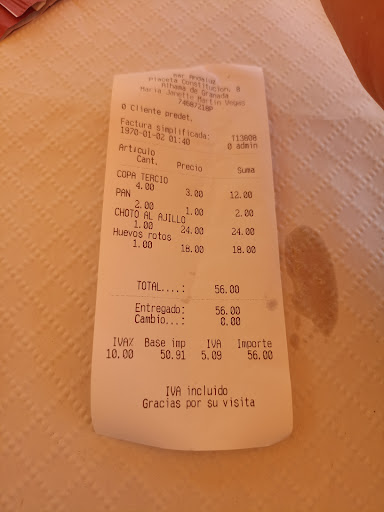 Read moreEs la primera vez que pongo una mala valoración, y reconozco que nos atendieron bien y rápido, pero, es la peor comida, que recuerde yo, haber tomado en mucho tiempo en ningun bar o restaurante, además aunque pedi los platos sabiendo que los precios, muy económicos no son, estando buenos, se paga con gusto, pero una vez los trajeron y probamos, no son caros, son un atraco, porque no estaban para comérselos, no los devolví por vergüenza. El choto me gusta mucho y suelo pedirlo por costumbre, pero de mal como este no me lo habían puesto nunca, requeterefrito, pasadisimo, aceitoso, desmenuzado, sabor malo y con patatas congeladas, 24€. Los huevos rotos con gulas y gambas, un plato con muchísimas patatas congeladas, 2 huevos muy hechos, gulas tiesas, pasadisimas y saladas, ni se podían masticar y unos trocitos de gambas, que había que buscar, pasadas y durísimas, como un plástico, plato incomible, por solo 18€. Para repetir 56€ y con cara de tonto. Como no mire antes, las valoraciones que tienen, con la cantidad de opciones que...