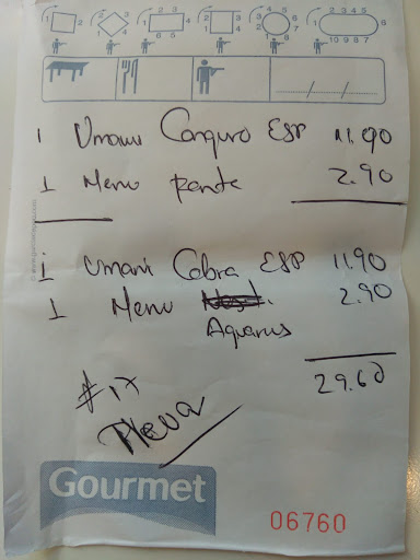 Resulta que nos dimos cuenta de que nos dieron el pedido 16 a nosotros que teníamos el pedido 17 y a los que tenían el pedido 16 le dieron nuestro pedido 17. Nosotros queríamos 2 UMAMIS de canguro y cebra y no se que carne comimos, porque ni idea de la carne que pidieron los del pedido 16 que era el que teníamos en nuestras manos. 30€ por 2 menus de patata+bebida+hamburguesas y que a saber si hemos cenado pollo a precio de canguro y...
