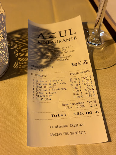 Read moreI had come here out of recommendation. I had ordered the chicken and seafood rice without the seafood (allergy). When it arrived it was very salty and the lemon could not quench that. I didn’t see a waiter for ages to notify until I had my food collected (I hadn’t finished my rice due to the salt and lack of seasoning). I spoke to the waiter about this and he informed that if I had told him he would’ve replaced it but it wouldn’t have mattered (plus I hadn’t seen a waiter since I was first served) as it was very salty and under seasoned for my first time having paella. I quizzed if it would still be the same price as there was no seafood and 2 pieces of plain small pieces of chicken (pictured below)? the waiter said yes😕 For what it was worth - it wasn’t worth 18 euros (maybe 7 for the fact it was salty rice and 2 small pieces of chicken respectfully). Wouldn’t have paella again following this overpriced experience. First time in Alicante and I can say I won’t be returning to Azul.