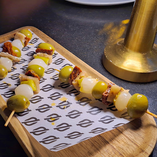 🍴 Lo primero que nos trajeron fueron unas gildas, que es un plato que, sin pasar nunca de moda, tiene sus altibajos, y ahora está en la parte alta de la rueda de la fortuna. Todos tienen gildas en sus cartas o en sus ofertas de tapeo. En este caso, se prepararon con sardina en lugar de anchoa y, sin sorprender, gustaron.