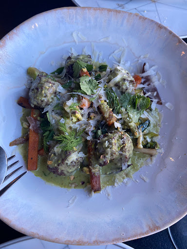 Quinto plato: curry verde genovés. Algarabía de verduras en su punto perfecto. Albondigas diminutas pero deliciosas. Todo embalsamado con una salsa verde con sabor excesivo. Nos sabe a perejil y romero.Mata todo el resto.