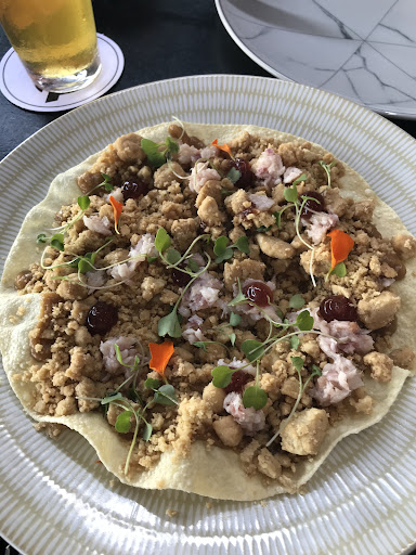 🍴 Lo siguiente que nos sirvieron fue una coca de mollitas crujiente con anguila. Como podemos ver por la foto, hay una masa muy fina en la parte de abajo, que es lo que le da el toque crujiente, luego encima tenemos las mollitas y los tropezones de anguila con su toque ahumado. La verdad es que yo no soy mucho de mollitas, no me acaban de convencer, pero en este caso, con la salsa que llevaba, estaba bastante jugoso, crujiente y con ese punto umami de la anguila. Sorprendente y lo volvería a pedir.
